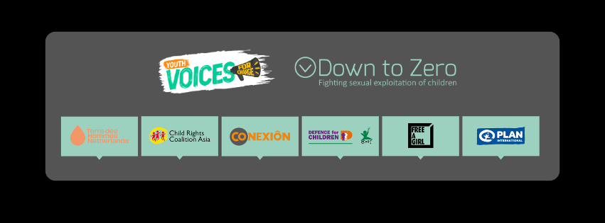 The Down to Zero (DtZ) Alliance is a global initiative of six organizations: Terre des Hommes Netherlands, Child Rights Coalition Asia, Conexión, Defence for Children-ECPAT, Free a Girl, and Plan International Nederland. The DtZ Alliance aims to prevent and stop the sexual exploitation of children in twelve countries in Asia and Latin America by implementing a three-year program called Stepping Up the Fight Against Sexual Exploitation of Children (SUFASEC) funded by the Dutch Ministry of Foreign Affairs.
