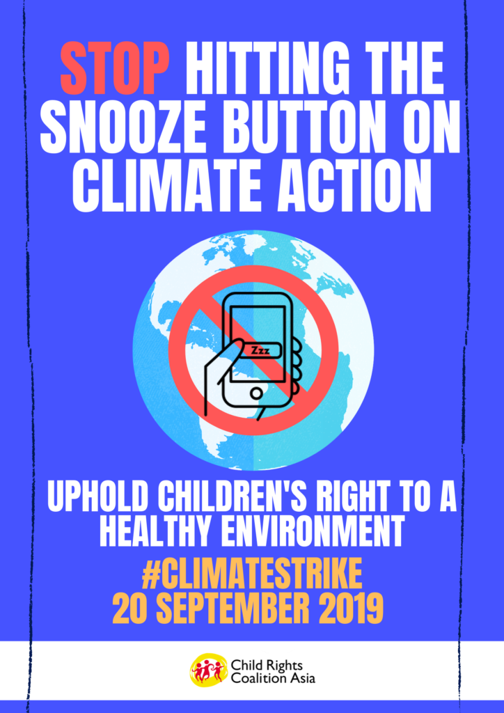 Members of the Child Rights Coalition Asia and CRC Coalition Philippines Secretariat joined the Global Climate Strike kick-off led by 350 Pilipinas on September 20, 2019, Friday, held at the University of the Philippines College of Science Amphitheater, Diliman, Quezon City. The Coalition demands climate justice and calls for the upholding of children’s right to a healthy environment.